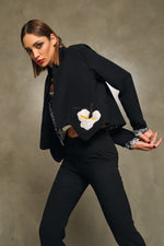 This black cropped blazer combines sleek tailoring with a modern edge, featuring a unique print on the waist for a bold touch. The silk printed lining adds a layer of luxury, making it the perfect piece to elevate any look with effortless style.