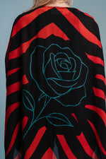 Stand out with our red & black tiger kimono, featuring bold prints and a sparkling strassed turquoise rose on the back. Lightweight and stylish, effortless style for every occasion.