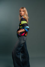 Multicolor bomber jacket crafted from soft silk-touch custom print fabric, offering a stylish and comfortable statement piece for any outfit.