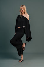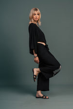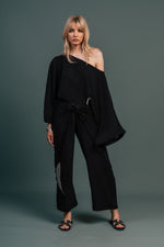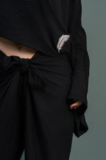 Sleek black wide-leg wrapped pants accented with a silver feather on the leg, paired with a coordinating black top for a modern and stylish look.