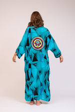 Elevate your wardrobe with the Guisha Turquoise Long Kimono. Featuring exquisite embroidery, this piece blends artisanal detail with a sleek, flowing design for a strikingly versatile look.