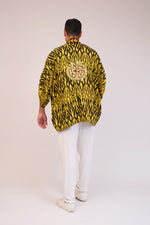 This kimono features intricate Fire Aum embroidery on the back, blending Aztec-inspired patterns with spiritual symbolism for a striking and meaningful design.