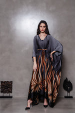 A fusion of earthy tones and bold patterns, this kaftan offers a statement look with effortless comfort. Its flowing silhouette and intricate print make it a versatile piece, perfect for any occasion.