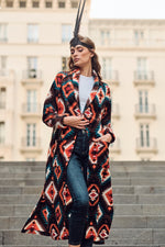 Wrap yourself in warmth and style with this brown tribal long fleece coat. Featuring intricate tribal patterns, it combines cozy comfort with a bold, earthy aesthetic. Perfect for layering over any outfit, this coat adds a touch of boho chic to your colder-weather wardrobe.