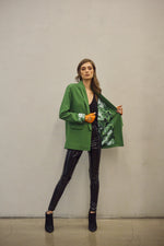 Versatile and stylish, this clover green reversible blazer features a printed inner lining for a pop of pattern when you need it. Wear it two ways to suit your mood—clean and classic on one side, with a playful twist on the other.