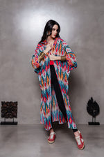 A vibrant fusion of culture and craftsmanship, this kimono features a striking tribal-inspired print with rich, bold hues. Its flowing silhouette captures the essence of Marrakesh, making it a statement piece for any occasion.