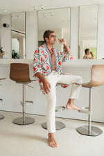 Beige and orange peacock feather printed mandela featuring a navy zigzag border and a vibrant orange flower patch for a stylish, standout look.