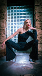 The Stardust One Sleeve Bodysuit is crafted from 100% crystal-studded jersey fabric, offering a sleek fit with a bold, sparkling finish. Perfect for statement looks and special occasions.