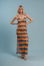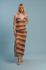 Turn heads with our chevron crochet maxi in vibrant sunset tones. Light and flowy, perfect for seaside strolls and summer nights.