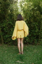 Radiate sunshine with the Yellow Seychelles Set. Featuring vibrant yellow hues and colorful shells adorning the waist of the skirt, this set captures a tropical, bohemian spirit, bringing warmth and playful energy to your look.